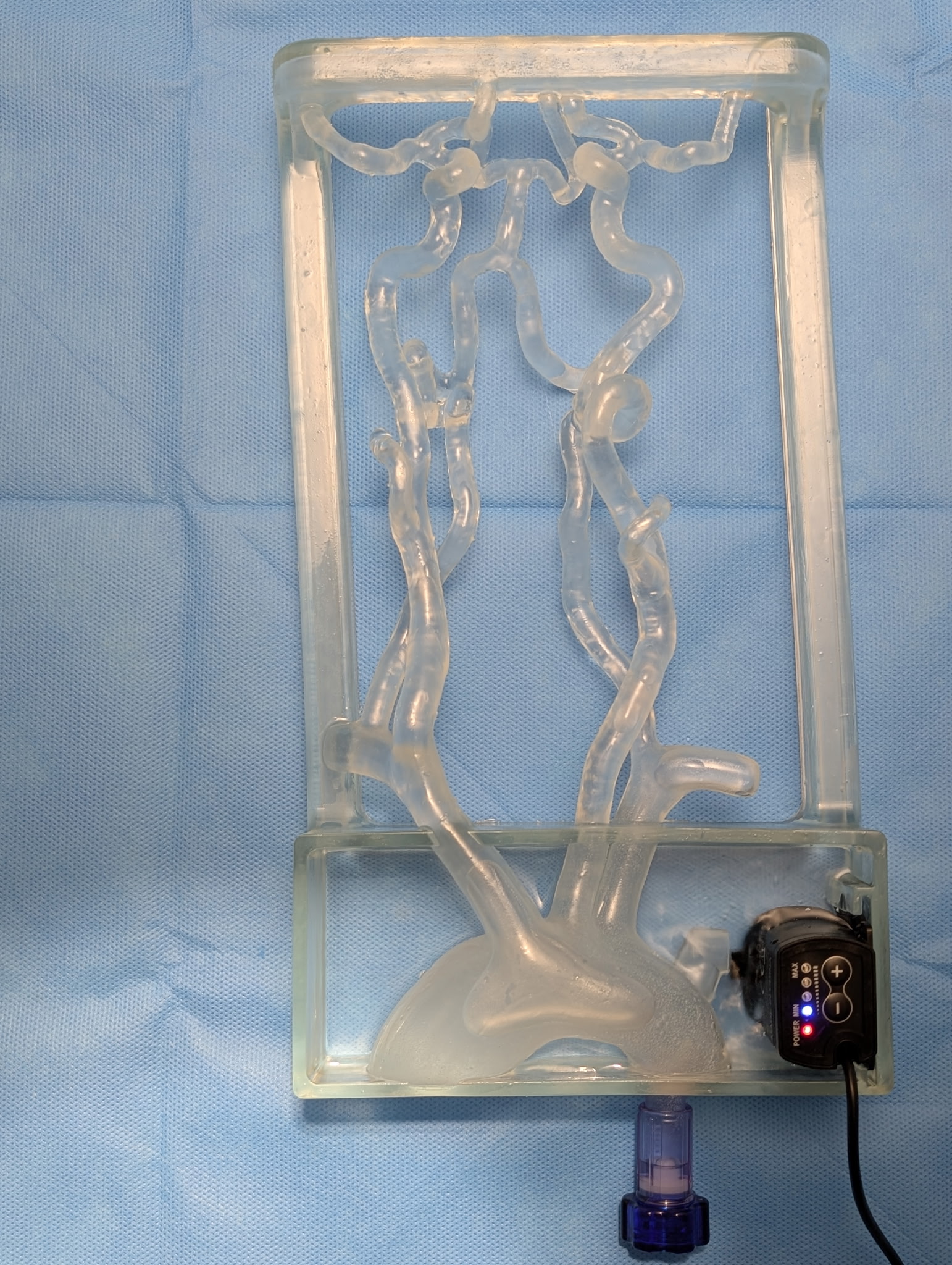 Aortic arch to proximal intracranial arteries Size: XL Dimensions: 13.5 in by 2.5 in by 7 in. Comes with pump, case, and RHV. Options for customization available upon request.